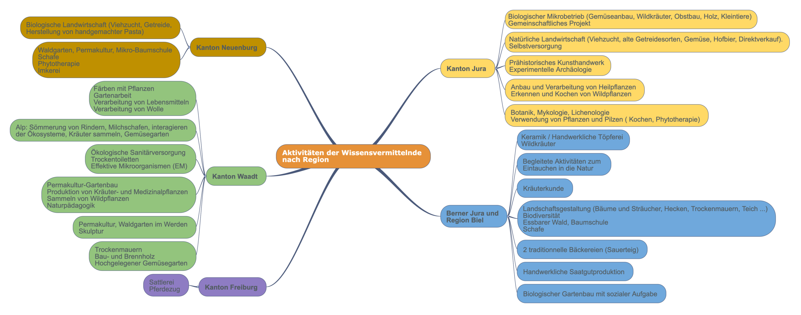 Entdecken Sie unten die vielfältigen Tätigkeitsbereiche der Wissensvermittelnde 2026 nach Regionen. Um die Möglichkeit zu haben, diese verschiedenen Bereiche zu entdecken und zu erlernen und die Kontaktdaten der Wissensvermittler*innen zu erhalten, werden Sie Wanderlernende*r! Klicken Sie auf das Bild, um es grösser zu sehen.